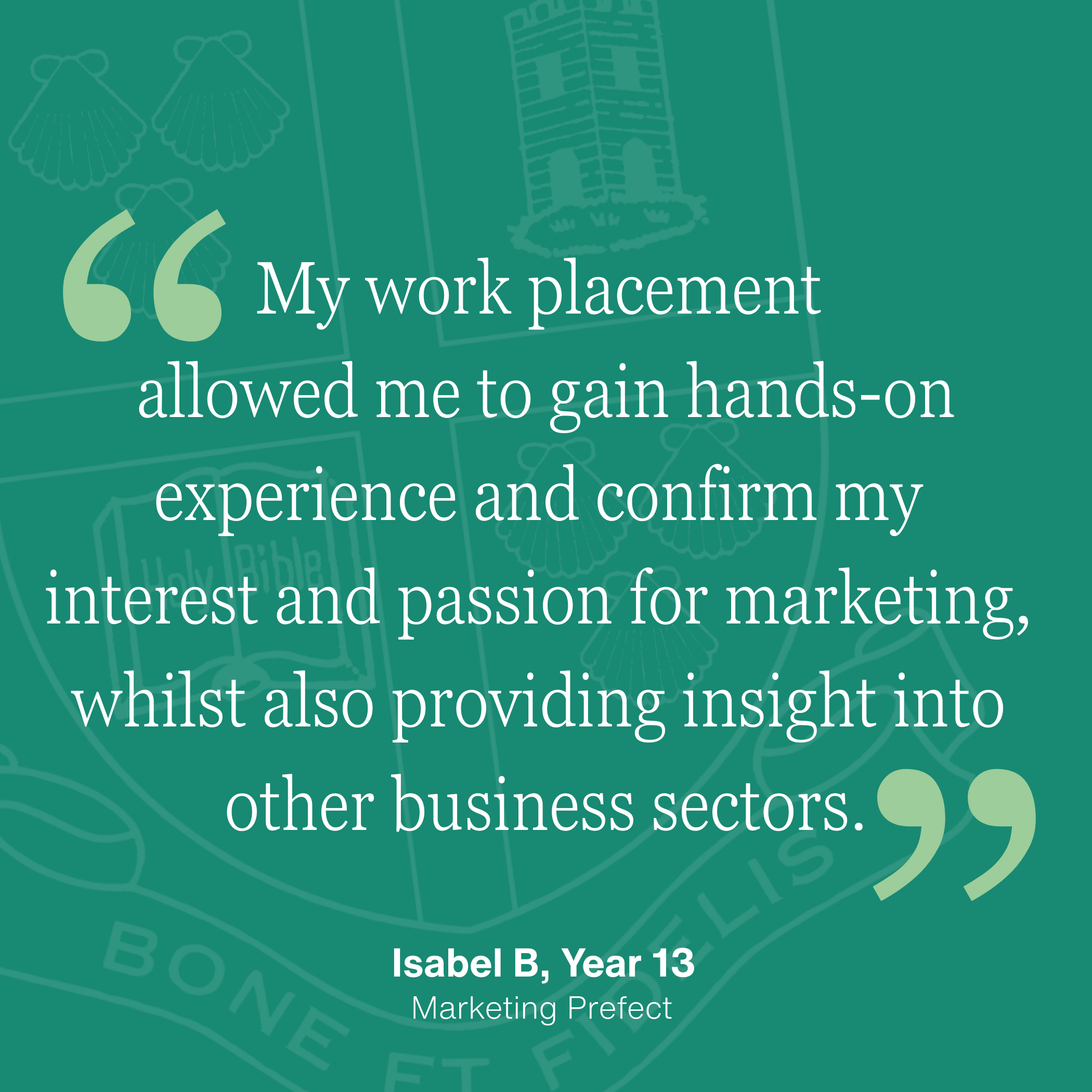 Isabel B in Year 13 is our Marketing Prefect for this year, and will be working with the Marketing team to create campaigns and social-media content. With aspirations in the Marketing industry, Isabel knew she wanted to take part in our Partnership Programme to learn more about this field.