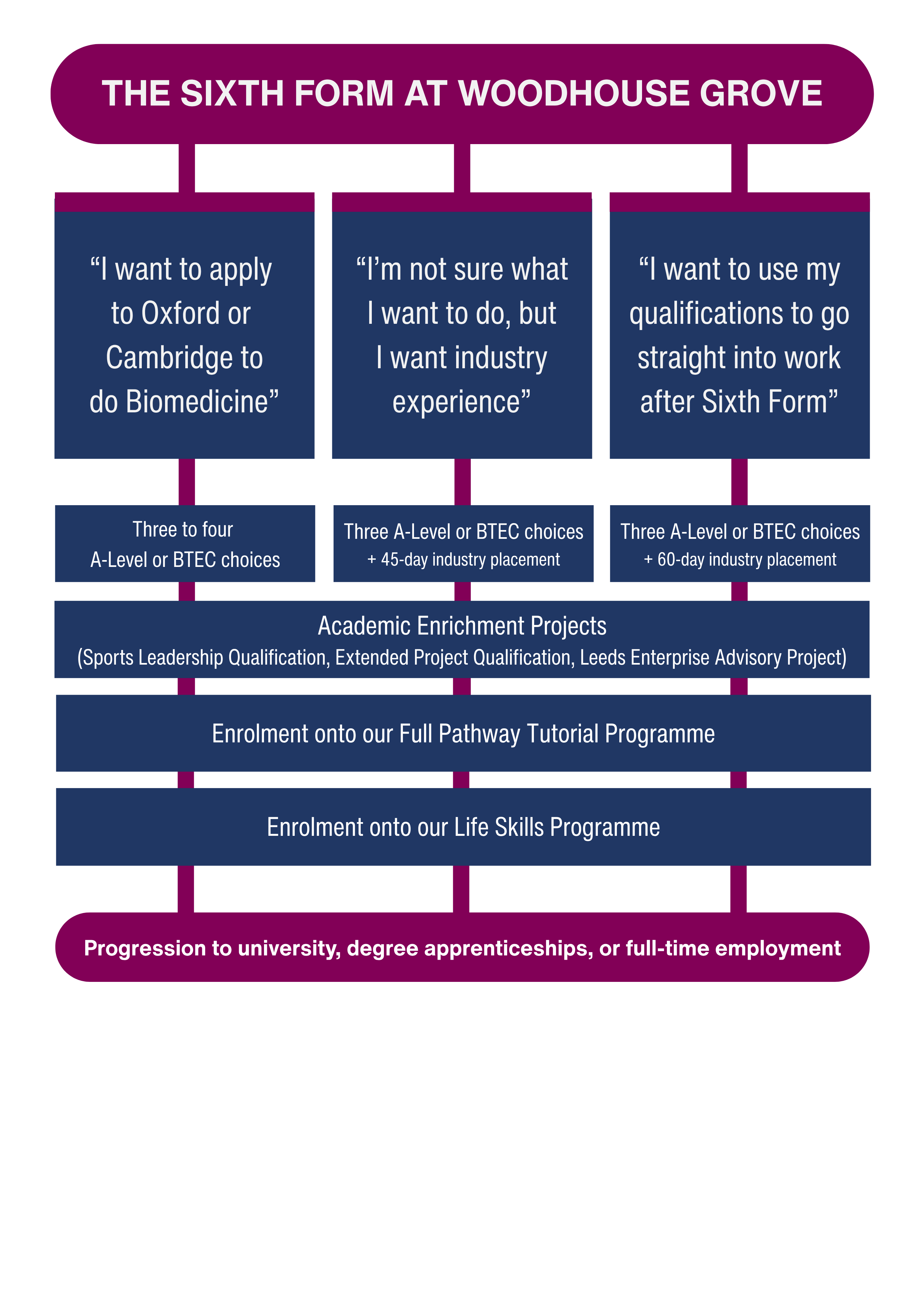 We are very aware that each student has their own set of aspirations and career-goals. As such, we cater each students’ journey through Sixth Form by targeting their desired destination, whether that be University, an Apprenticeship or Degree Apprenticeship, or going straight into full-time employment.