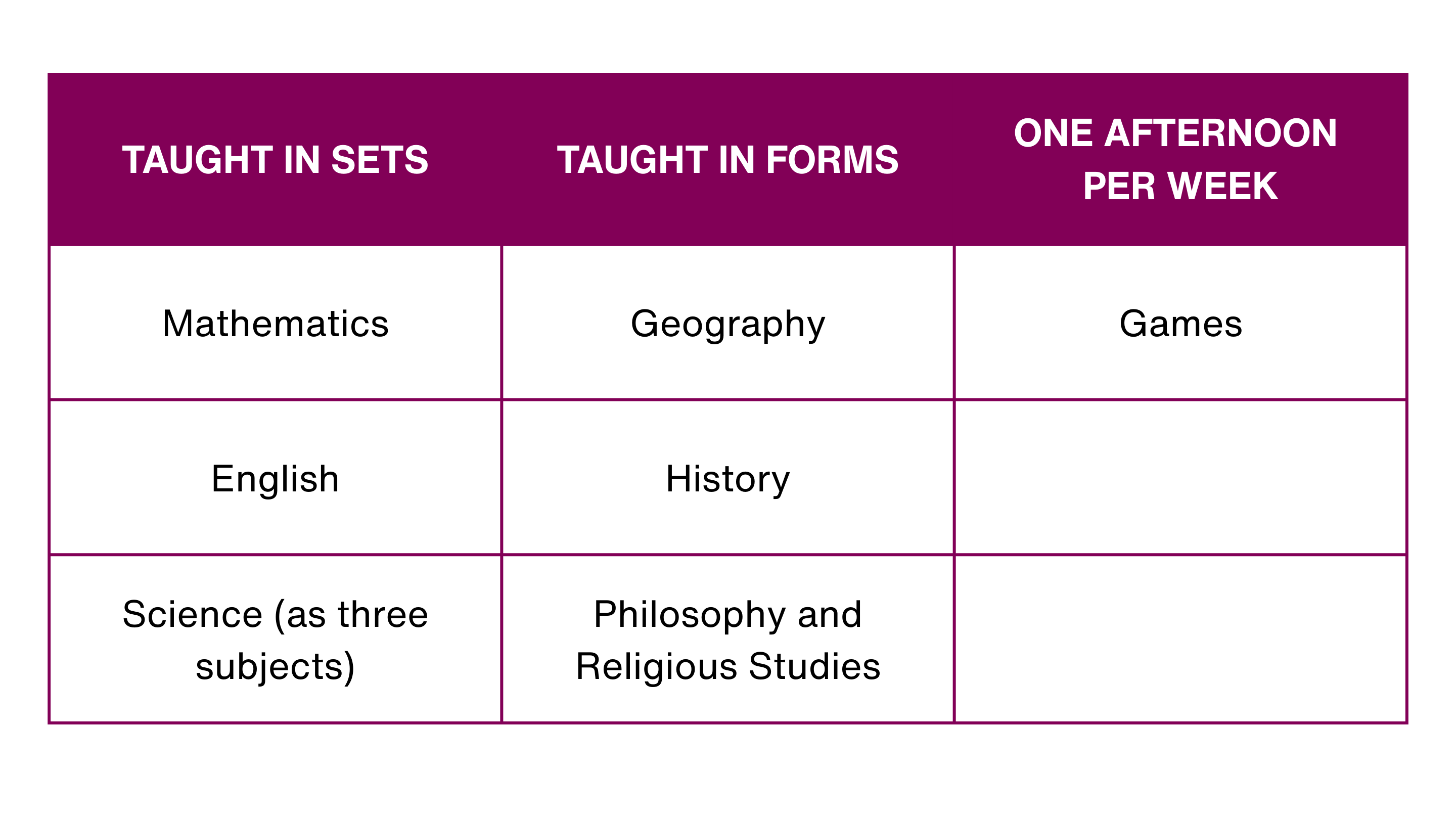 Pupils also have to study three of the following subjects: art, computing, design technology, drama, French, German, music and Spanish.